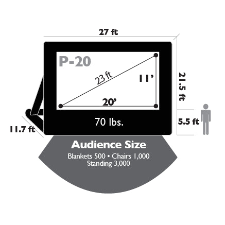 20’ x 11’ (23’ diagonal) – The biggest projection screen in the Open Air Event Pro Series, our 20’ foot screen features a 220 square feet projection screen and can comfortably seating an audience of well over 500 and only weigh 140 pounds.